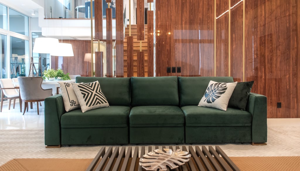 A sala de estar é o coração do espaço, com um generoso sofá verde profundo que adiciona um toque de personalidade e aconchego. Almofadas com estampas geométricas e tropicais complementam a paleta de cores, trazendo equilíbrio entre modernidade e natureza. O painel ripado de madeira e dourado ao fundo confere imponência e requinte ao ambiente, criando um visual marcante e harmonioso.