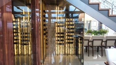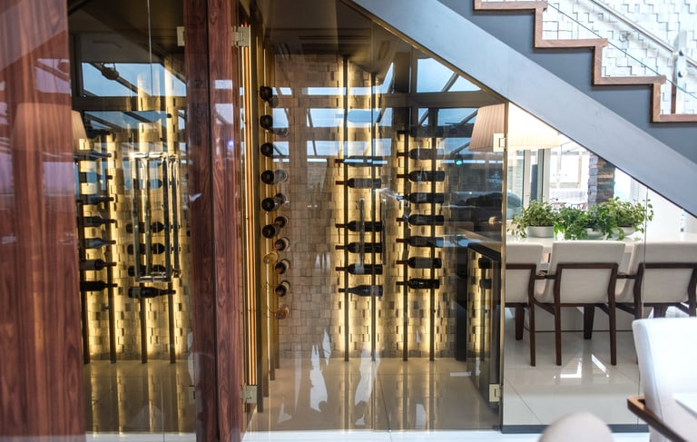 Já a adega, estrategicamente posicionada sob a escada, une funcionalidade e beleza. A iluminação indireta destaca o revestimento em pedra e a estrutura metálica que acomoda as garrafas, mudando o espaço em um verdadeiro ponto de destaque da casa. O vidro reflete a ambientação ao redor, ampliando a sensação de sofisticação e continuidade visual.