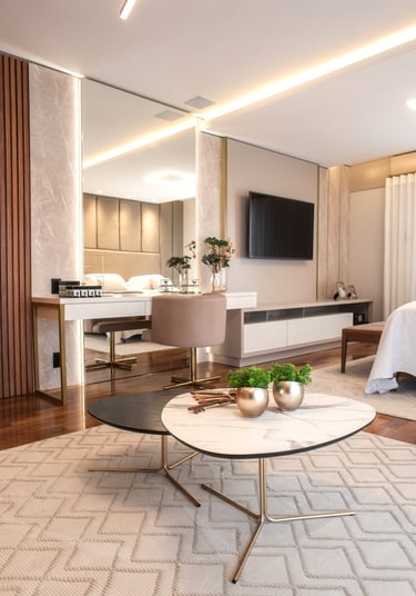 Este projeto de interiores reflete um design sofisticado e contemporâneo, onde cada elemento foi cuidadosamente escolhido para transmitir requinte e aconchego. A composição dos materiais nobres, como madeira de alto brilho, vidro e detalhes metálicos, cria um ambiente sofisticado e atemporal.