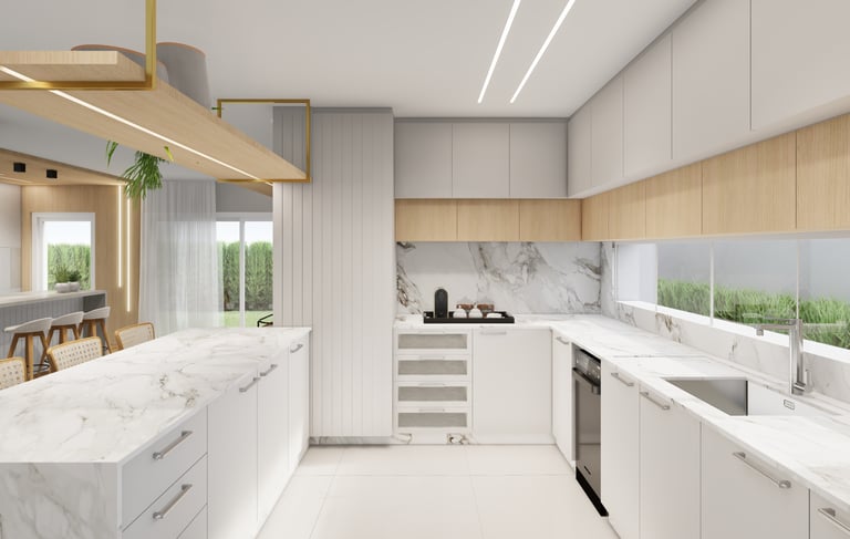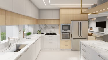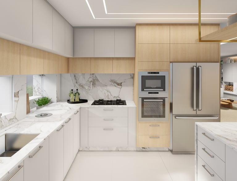 Esta cozinha oferece espaço adequado para todos os eletrodomésticos, integrando praticidade e estética.