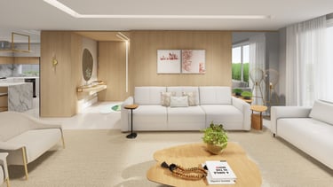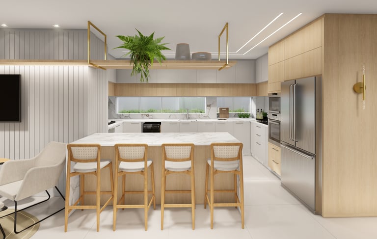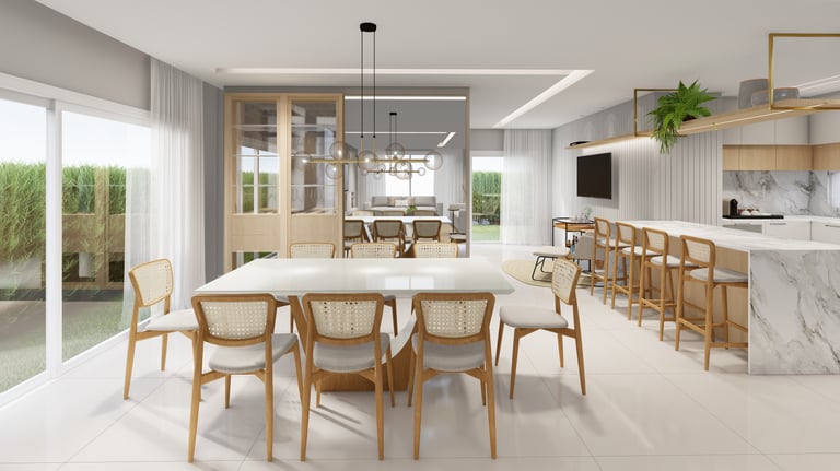 Trabalhamos os espaços de estar, jantar e área da churrasqueira com uma paleta de tons claros e neutros, priorizando a suavidade e a integração visual entre os ambientes.