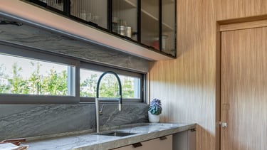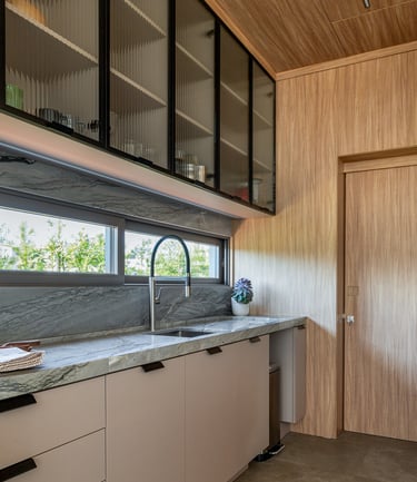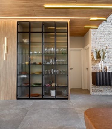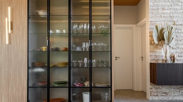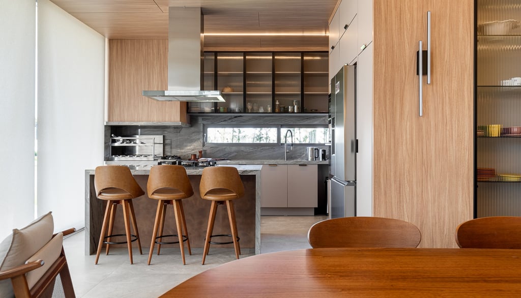 A ilha central assume papel protagonista, funcionando como ponto de encontro e apoio para refeições rápidas, com banquetas que equilibram conforto e leveza. Os armários com portas em vidro canelado adicionam transparência e refinamento, ao mesmo tempo em que organizam e expõem utensílios de maneira sutil.