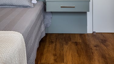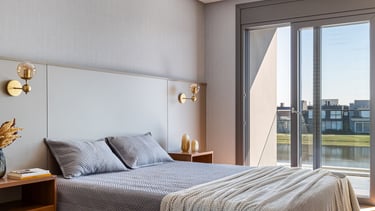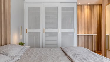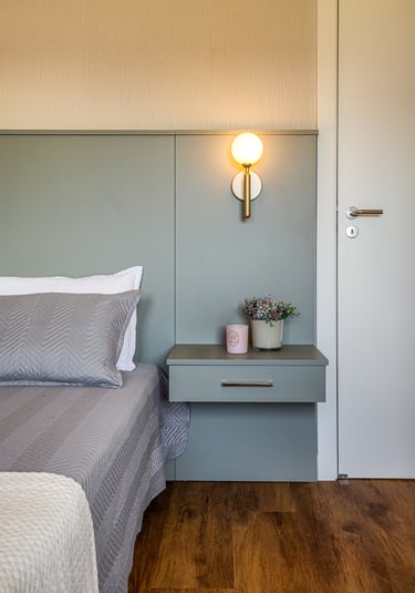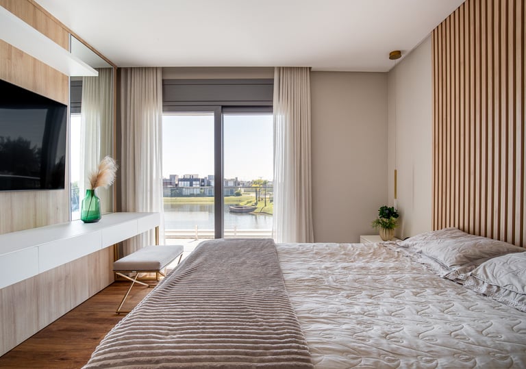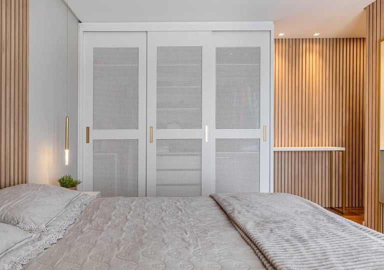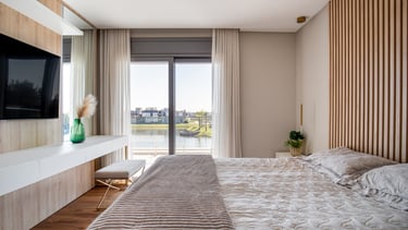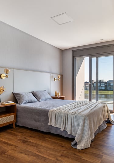A suíte foi projetada como um refúgio de conforto e tranquilidade, onde o design contemporâneo se alia à funcionalidade para criar uma experiência acolhedora. A marcenaria em tons naturais percorre paredes e mobiliário, promovendo unidade visual e reforçando a sensação de aconchego e sofisticação.