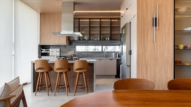 Este ambiente integra cozinha e área social de forma fluida e sofisticada, valorizando a convivência e a funcionalidade no dia a dia. A marcenaria em madeira natural percorre teto e planos verticais, criando unidade visual e reforçando a sensação de acolhimento, enquanto o layout aberto favorece a circulação e o uso contínuo dos espaços.