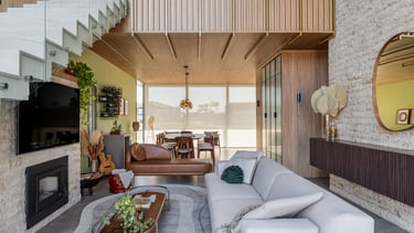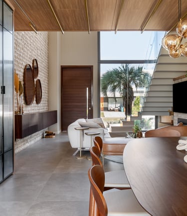 Esta sala de estar foi concebida como um espaço de convivência amplo, acolhedor e visualmente fluido, onde arquitetura, interiores e iluminação dialogam de forma equilibrada. O pé-direito duplo reforça a sensação de amplitude e permite que a luz natural percorra o ambiente ao longo do dia, valorizando volumes, texturas e materiais.