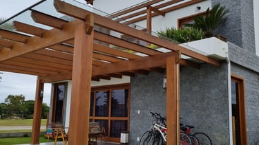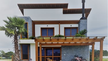 O projeto traz como destaque a cobertura com telhas shingle, com dois panos de diferentes níveis, executada em estrutura de madeira aparente, que imprime identidade regional e acolhimento à volumetria da casa. Essa escolha dialoga com a linguagem do entorno e se harmoniza com os demais elementos construtivos — como os fechamentos em pedra natural e as esquadrias em madeira — criando uma fachada equilibrada, aconchegante e sofisticada.