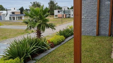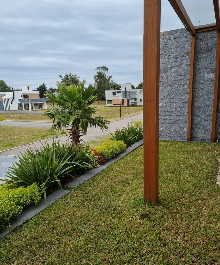 O térreo integra estar, jantar e varanda sob uma ampla pérgola de madeira, com abertura para o jardim frontal e o pôr do sol. O paisagismo leve, com palmeiras e vegetação rasteira, complementa a composição com beleza e baixa manutenção.