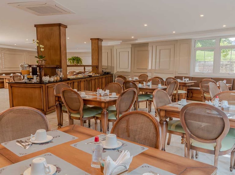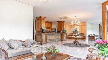 O lobby, o bar e as áreas de estar foram projetados para proporcionar experiências agradáveis aos hóspedes, com iluminação suave, elegantes lustres de cristal e elementos de design atemporal.