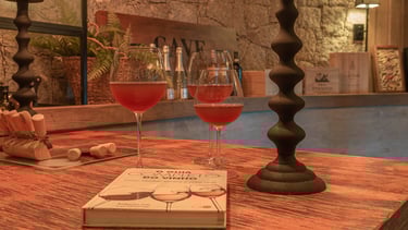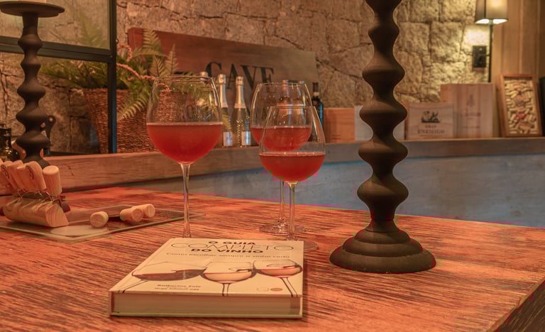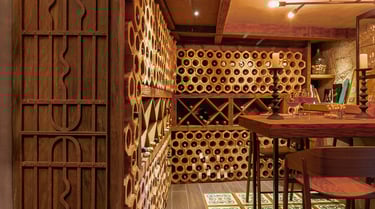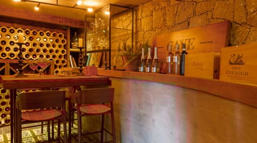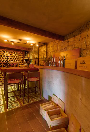O ambiente traz uma atmosfera acolhedora, com paredes de pedra natural que remetem à solidez e ao frescor das antigas caves. O mobiliário em madeira de tons quentes reforça a sensação de aconchego, criando um refúgio perfeito para degustações e momentos de contemplação. A iluminação indireta, distribuída de forma estratégica, valoriza os materiais e cria um jogo de luz e sombra que convida ao relaxamento.