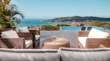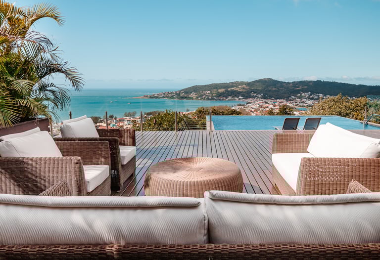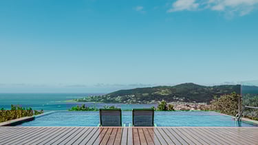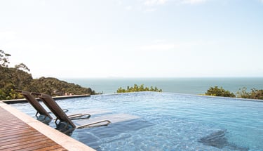 A piscina de borda infinita se dissolve no horizonte, criando uma transição suave entre o céu e o mar.
