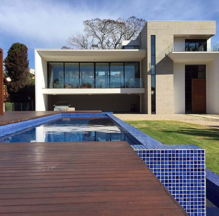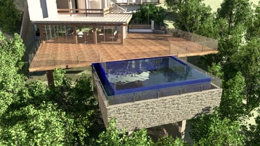 Elevada sobre uma estrutura sólida, a piscina se integra ao cenário de forma harmoniosa, enquanto os painéis de vidro garantem segurança sem interromper a vista.
