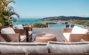 O deck de madeira, espaçoso e acolhedor, convida à contemplação, seja sob a luz suave da manhã ou ao entardecer, quando o sol se despede em tons dourados sobre a paisagem.