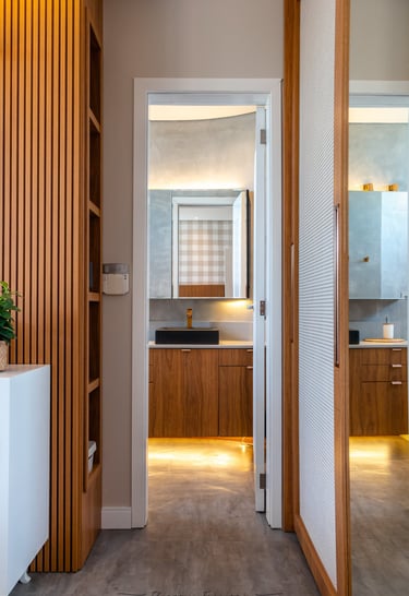 Este projeto de interiores reflete um design sofisticado e contemporâneo, onde cada elemento foi cuidadosamente escolhido para transmitir requinte e aconchego. A composição dos materiais nobres, como madeira de alto brilho, vidro e detalhes metálicos, cria um ambiente sofisticado e atemporal.