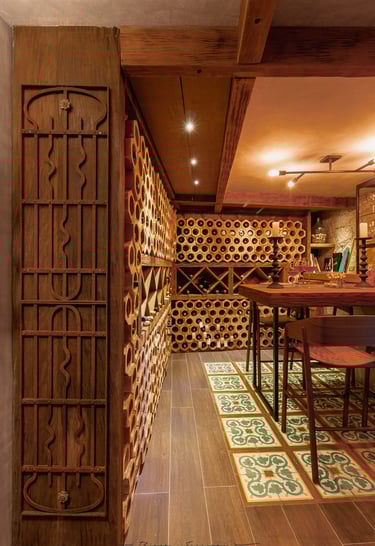 No piso, ladrilhos hidráulicos com desenhos sutis trazem um toque de cor e personalidade ao ambiente, contrastando suavemente com os tons neutros predominantes. Cada detalhe foi pensado para transformar essa adega em um espaço de encontro e apreciação, onde o tempo desacelera e os sentidos se aguçam.